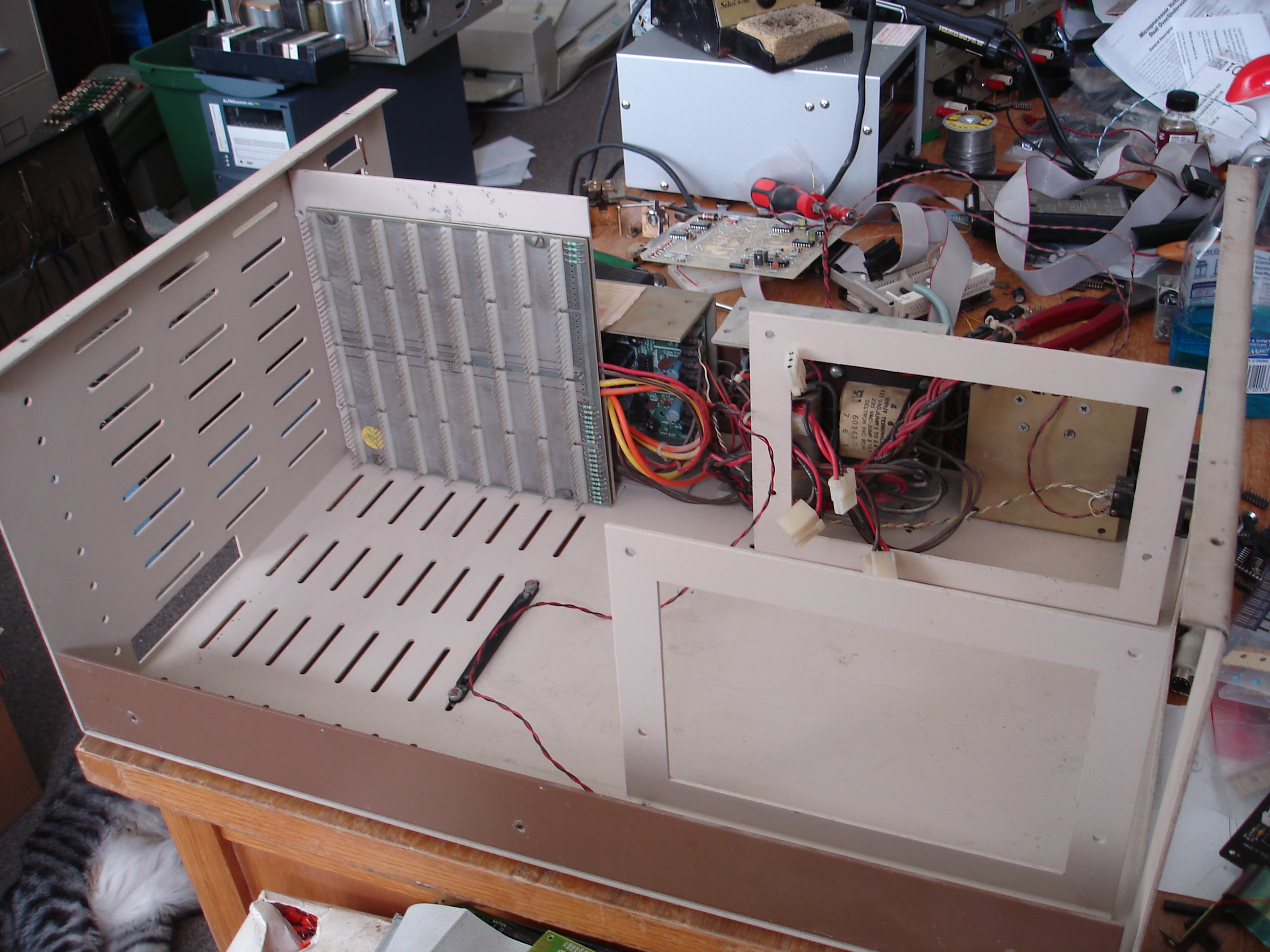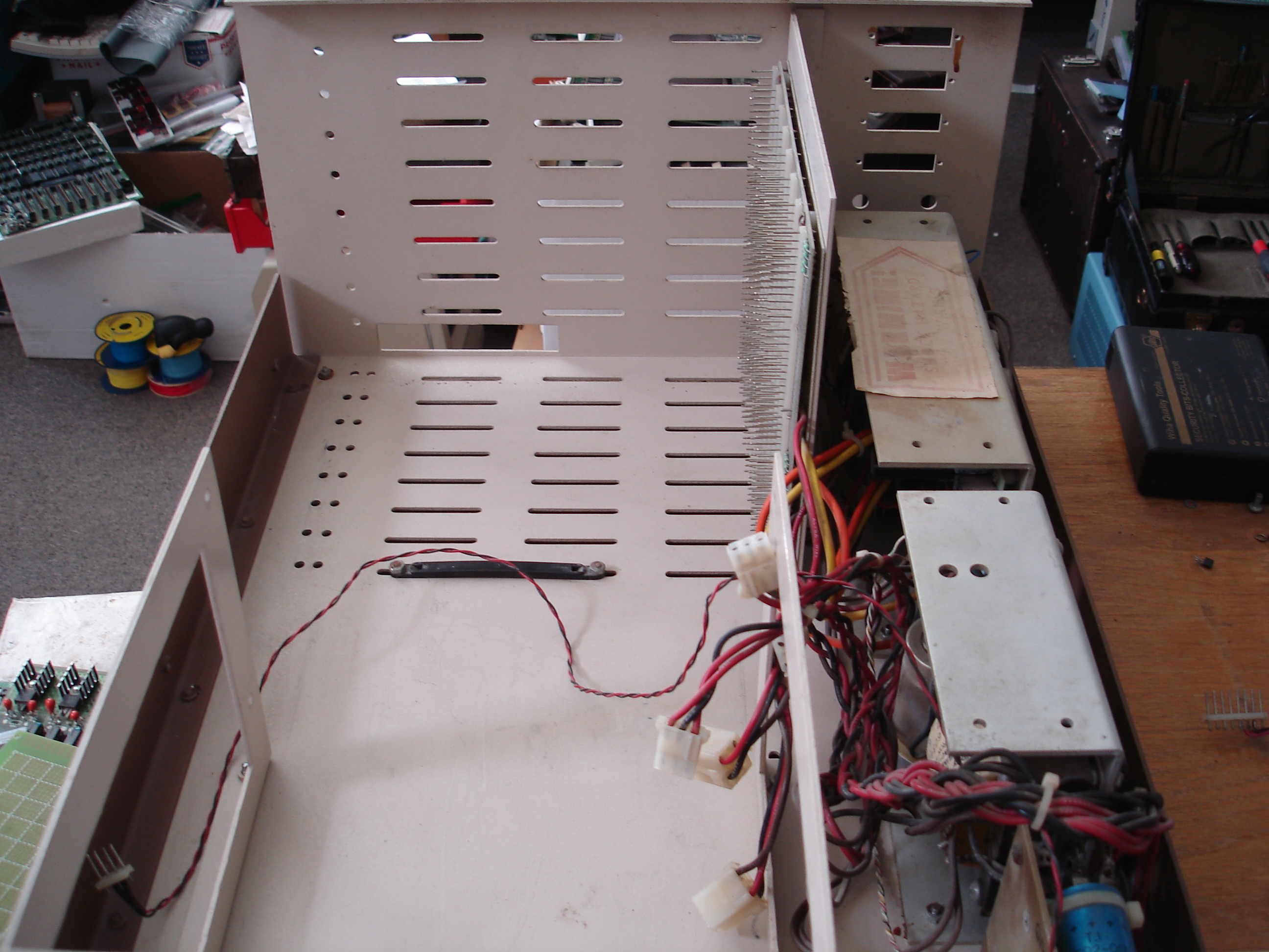 I didn’t think to take pictures of the original mess, but it went outside for an immediate vacuuming and blow-out with compressed air. All boards were removed, vacuumed, cleaned with a brush, then blown out. I removed the backplane, power supplies, and removable metal brackets from the case. The metal bits were all washed with soap and water. I finally thought to take pictures when the power supplies were back in: