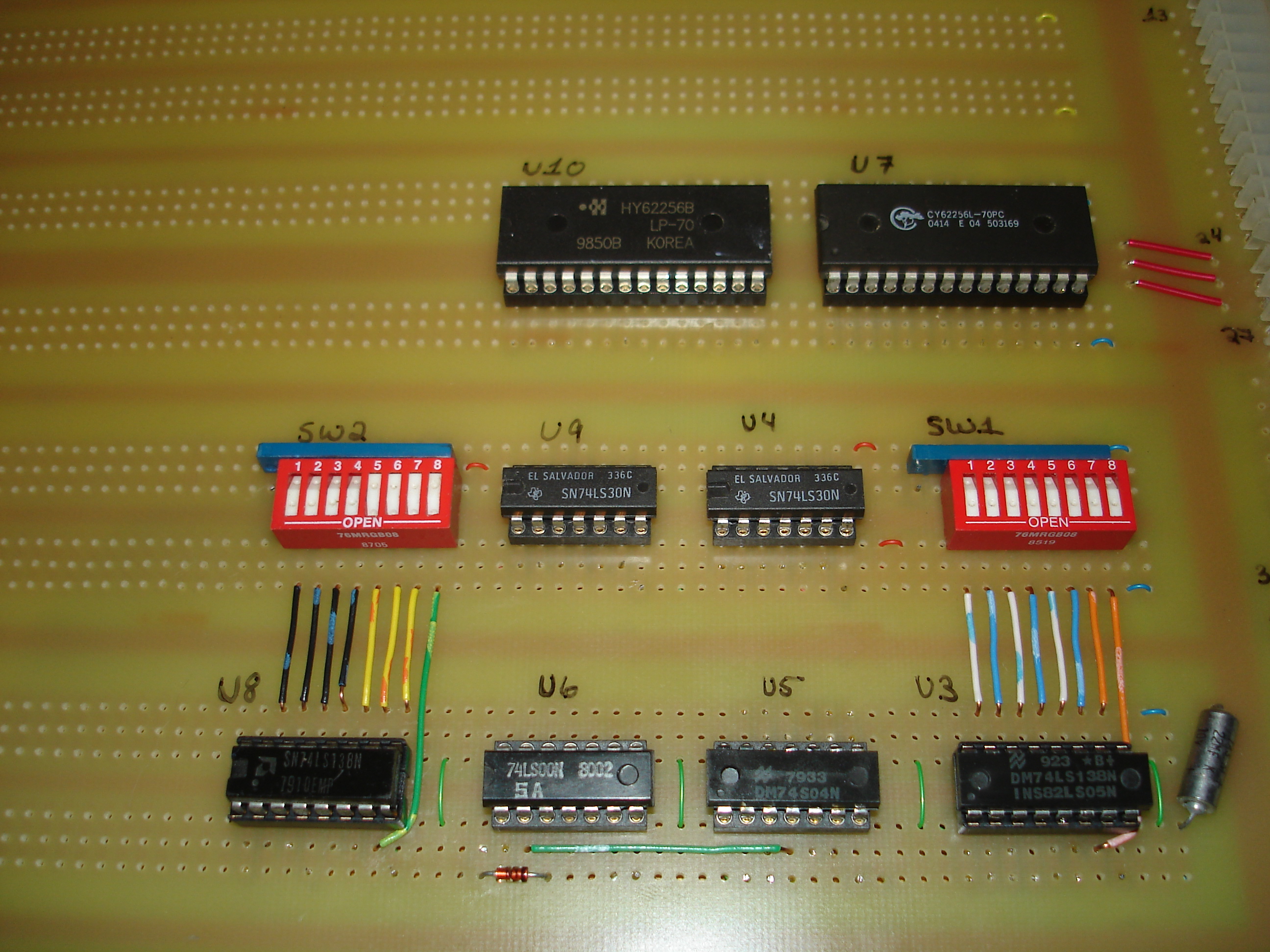 Since the new SRAM at U10 was mostly bussed directly to the existing SRAM at U7, I went ahead and connected it up first. Make sure to skip pin 20 on the new SRAM – this will be fed from the segment select circuit for the upper half of memory. The segment select circuit is almost identical to the circuit used in the 32K RAM board, except that pin 4 of the 74LS138 is fed with the inverted /A15. As you can see from the pictures, my layout of SW2, U8, and U9 mirrors that of the 32K layout. Don’t forget to connect U8 pin 5 to ground if you’re not using memory management!