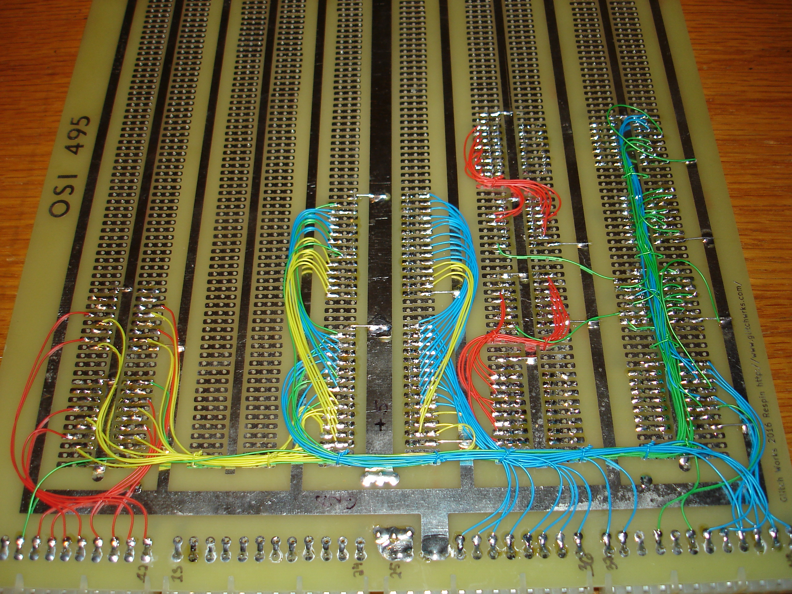 With the 32K OSI RAM board working, I decided to expand it to a full 64K using the expandable features I’d planned into the original 32K board. Built on the same OSI 495 prototype board as the original, this 64K expansion requires minimal modification to the 32K board, and the addition of three additional ICs, including the 32K x 8 static RAM.