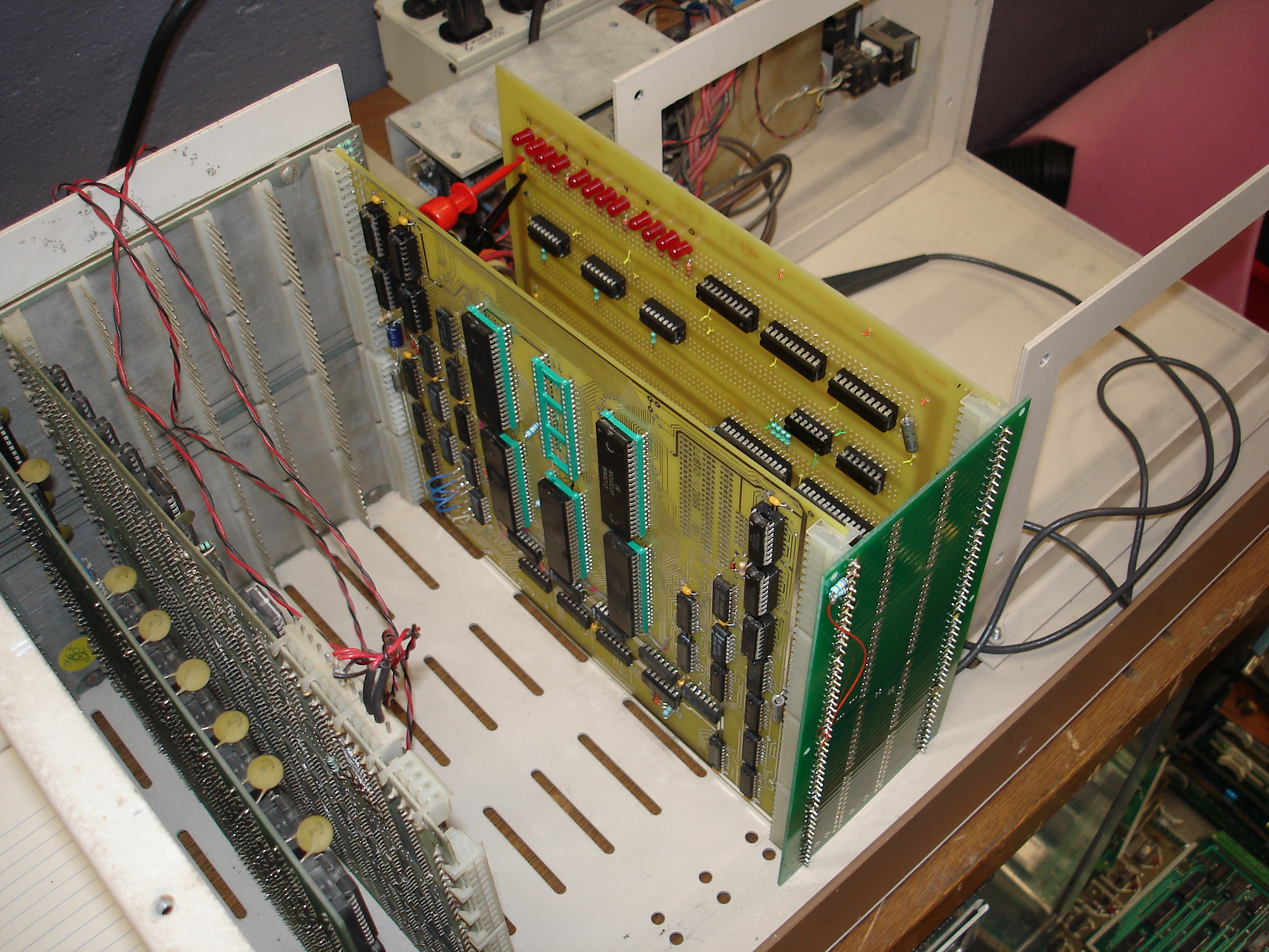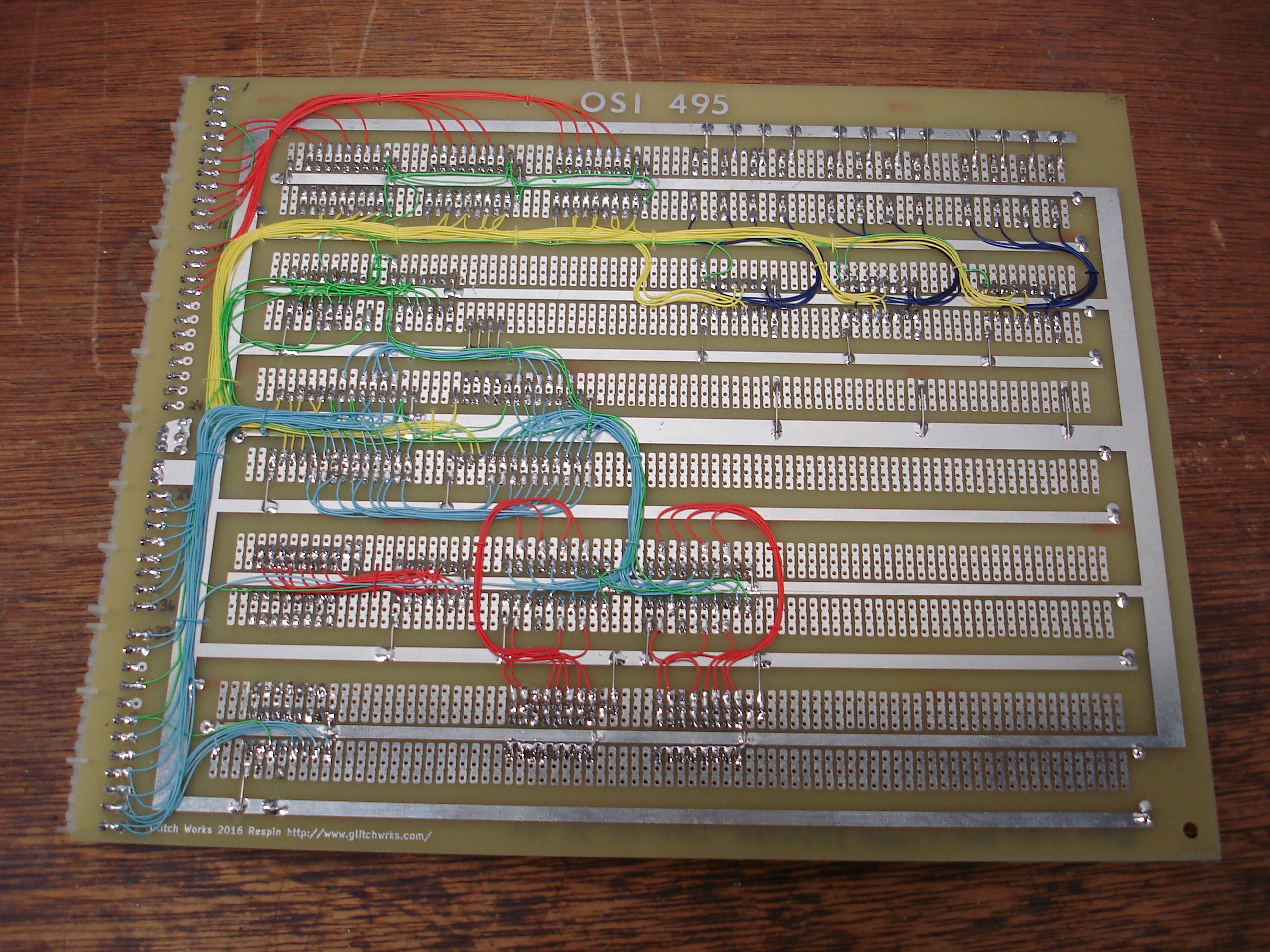 When installed in a regular OSI system, the 560Z goes in “backwards.” Not sure what the idea was with this design, but on assembling the board I was convinced that something had gone wrong with the scanning process and I was now the proud owner of a batch of useless boards! It’s convenient to install the 560Z in the frontmost slot in the chassis, which allows the short backplane to overhang empty space. I moved the rest of the OSI boards back further so that I could access the front of the 560Z with my logic probe for testing and debugging. Here’s a picture with the 560Z hooked to a custom 32KW RAM board with the reproduction 582 backplane: