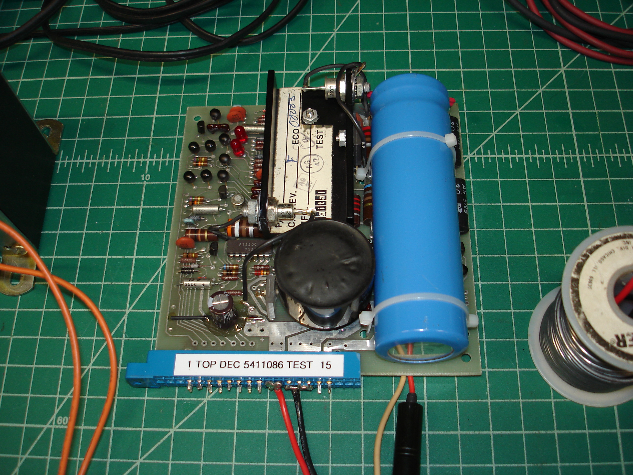 The 5411086 was of course cleaned and dried in the course of repairs. I also replaced the old 500 uF output capacitor since it smelled of electrolyte leakage. I used a modern Nichicon low ESR capacitor since the output is a switchmode supply output. I ended up cutting the damaged edge connector traces back and soldering a short wire pigtail to the AC input traces: as luck would have it, there’s a two pin Mate-n-Lok connector on the AC line between the AC transformer and the little pigtail that goes to the 5411086. I took the chance to add an inline 15A fast blow fuse, to prevent further damage to the 5411086 board. The board was then brought up using the Stancor 24 VAC transformer, a power meter, and a variac. For connections to the 5411086, I sawed the end off of a broken 25 x 2 card edge socket with proper 0.156” spacing:
