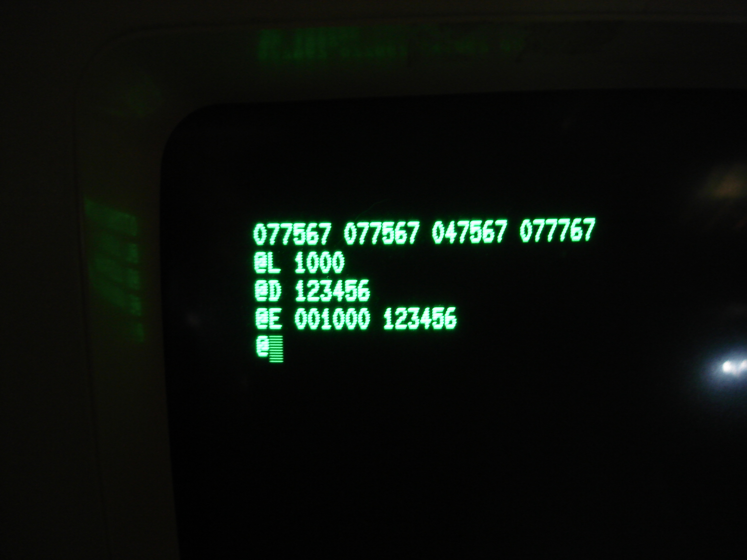 Success! The machine came up and was able to examine and deposit memory and run small test programs from the front panel! The failure of the rectifier did not seem to have damaged any of the system’s boards. This is likely due to the inclusion of overcurrent shutdown and crowbar protection in DEC’s power supply designs. With basic function confirmed, I added a DL11 async serial interface strapped for a CSR of 176500 (SLU0), connected a VT220 to the console port, and successfully booted XXDP from emulated TU58 tape. Here’s a picture of the front panel lit up, and the M9312 console emulator running on the VT220: